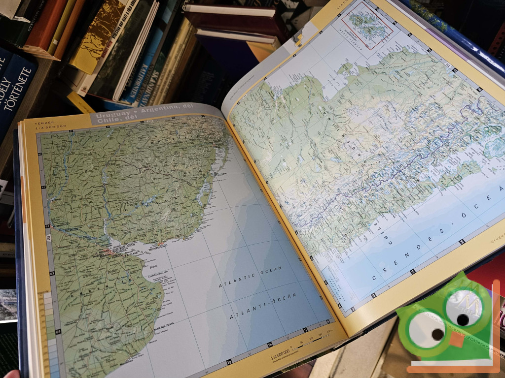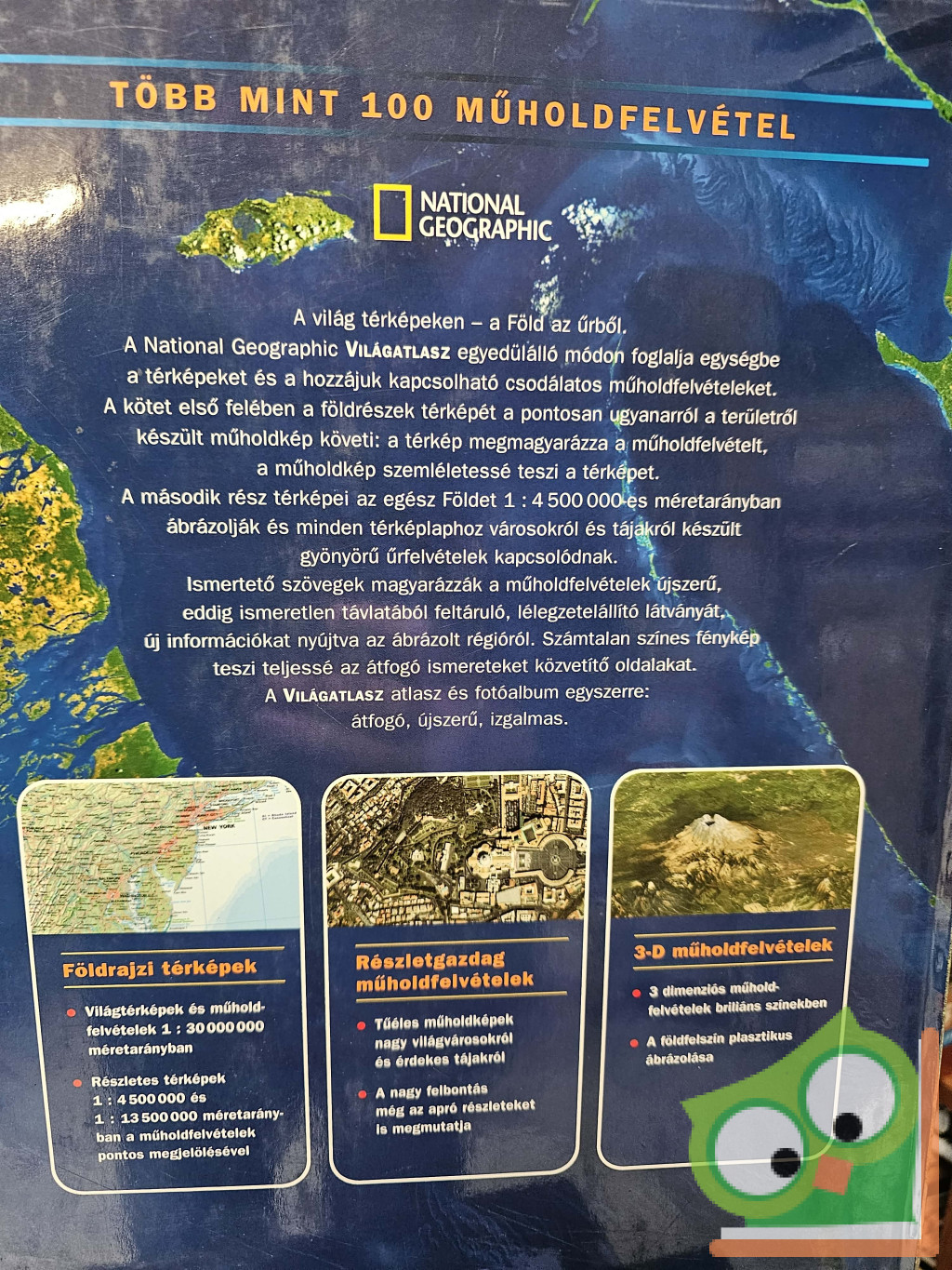 A világ térképeken – a Föld az űrből. A világatlasz egyedülálló módon foglalja egységbe a térképeket és a hozzájuk kapcsolható csodálatos műholdfelvételeket. A kötet első felében a földrészek térképét a pontosan ugyanarról a területről készült műholdkép követi: a térkép megmagyarázza a műholdfelvételt, a műholdkép szemléletessé teszi a térképet. A második rész térképei az egész Földet 1:4500000-es méretarányban ábrázolják és minden térképlaphoz városokról és tájakról készült gyönyörű űrfelvételek kapcsolódnak. Ismertető szövegek magarázzák a műholdfelvételek újszerű, eddig ismeretlen távlatából feltáruló, lélegzetelállító látványát, új információkat nyújtva az ábrázolt régióról. Számtalan színes fénykép teszi teljessé az átfogó ismereteket közvetítő oldalakat. A nagyméretű kötet atlasz és fotóalbum egyszerre: átfogó, újszerű, izgalmas!