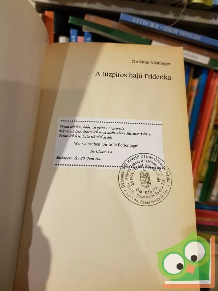Annanenő és Nokedlimacska úgy látja, hogy Friderika egy egészen normális kislány. De minden más ember harsányan nevet, amikor meglátja, különösképp a gyerekek! Kiáltozni kezdenek: „Itt jön a tűzpiros hajú Friderika! Tűz! Tűz! Lángol a feje! Vigyázat, közeledik a tulipiros!” Így szenved szegény Friderika, csak mert tűzpiros a haja. Mivelhogy nem közönséges tűzpiros hajzatot örökölt a papájától, néhány teljesen szokatlan dolog történik vele – A világhírű és rengeteg kitüntető díjat nyert osztrák írónő e műve most jelentik meg először magyar nyelven.v
