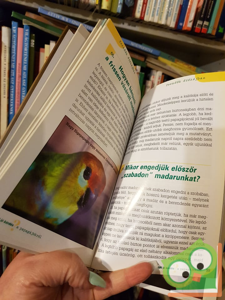 Káprázatos színekben tündöklő, beszélő madárcsodákról: a papagájok tarka világáról, szokásaikról, népszerű és különleges fajaikról tesz fel száz valóban jó kérdést és ad rá száz ugyan csak jó – érdekes és szakszerű választ a szerző. A fajok széles skálája vonul fel a kötetben Amerikától Afrikáig, Ázsiától Ausztráliáig – az amazonaspapagájoktól a kakadukig, a törpepepagájoktól a lórikig, a jákótól a nagy fügepapagájig. Megtudhatjuk melyik a legkisebb és melyik a legnagyobb papagáj, miért rikácsolnak, honnan tudjuk, fiú-e vagy lány, vegyünk e importmadarat, hogyan tanítsuk meg beszélni.