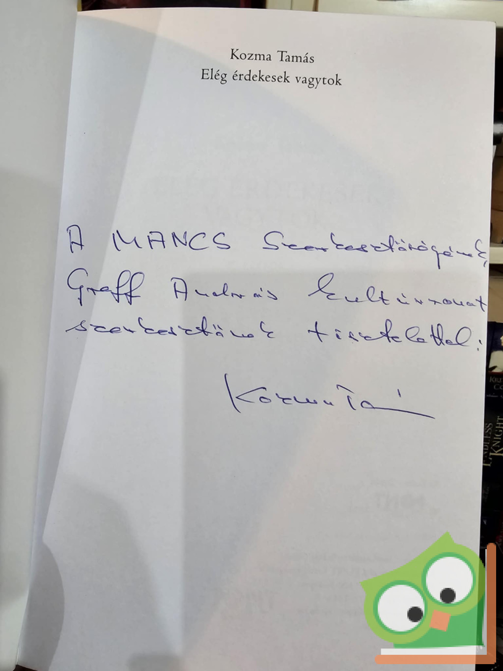 Kozma Tamás versei a kortárs költészet összefüggéseiben értelmezve "minta"-szerűnek tekinthetők: megismerszik rajtuk/bennük ez igencsak kusza kor (jelenünk) - és a kortárs líra minden jellegzetes hangütése. Ugyanakkor a klasszikus költészet ódon verssorai is ide visszhangoznak, de a mindent szabad harsány gesztusai is jelen vannak. Érzékeljük, mennyire fontos itt a "költészetben szólás" szabadsága, e szabadság mindent megtapasztalni kívánó közérzete... és a mindent megzabolázó irónia, önirónia. Kozma Tamásnál is kulcsszó a minden. Egyik versének utóiratában olvasható: "E versnek csak az a célja, hogy mindent felöleljen. A múltkoriból véletlenül kimaradt a macska. Ha majd minden művem össze lesz fűzve, ezt a részt esetleg átlapozhatod."Kedves Olvasó, Kozma Tamás érett és izgalmas költészete megérdemli, hogy Ön figyelmesen olvasva lapozza (ne olvasatlanul "átlapozza") a kötet minden versét. Valahol ott lesz az elkóborolt macska, a korszakok, amelyekben mi is kóboroltunk, szereplők... szóval minden ami még számít nekünk.
