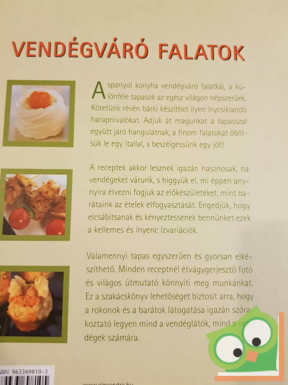 Valamennyi tapas egyszerűen és gyorsan elkészíthető. Minden receptnél étvágygerjesztő fotó és világos útmutató könnyíti meg munkánkat. Ez a szakácskönyv lehetőséget biztosít arra, hogy a rokonok és a barátok látogatása igazán szórakoztató legyen mind a vendéglátók, mind a vendégek számára.