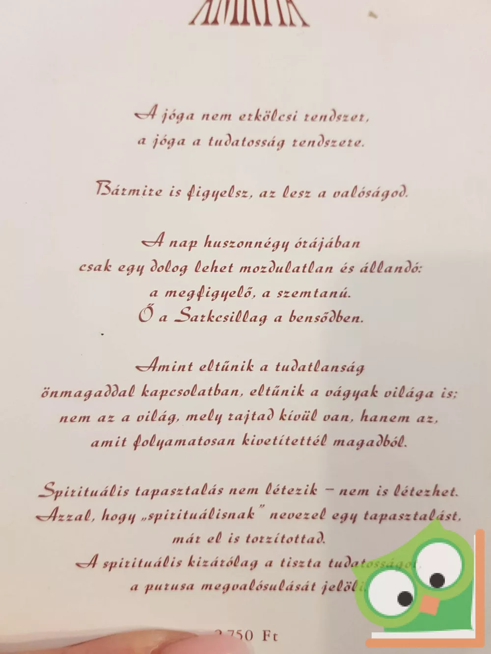 A jóga nem erkölcsi rendszer, a jóga a tudatosság rendszere. Bármire is figyelsz, az lesz a valóságod. A nap huszonnégy órájában csak egy dolog lehet mozdulatlan és állandó: a megfigyelő, a szemtanú. Ő a Sarkcsillag a bensődben. Amint eltűnik a tudatlanság önmagaddal kapcsolatban, eltűnik a vágyak világa is; nem az a világ, mely rajtad kívül van, hanem az, amit folyamatosan kivetítettél magadból. Spirituális tapasztalás nem létezik – nem is létezhet. Azzal, hogy „spirituálisnak” nevezel egy tapasztalást, már el is torzítottad. A spirituális kizárólag a tiszta tudatosságot, a purusa megvalósulását jelöli.