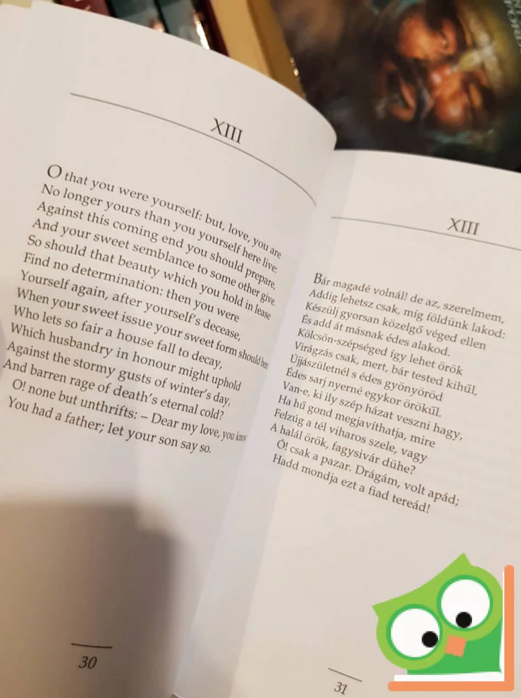 A kötet Shakespeare szonetteket tartalmaz Szabó Lőrinc fordításában magyar és angol nyelven.